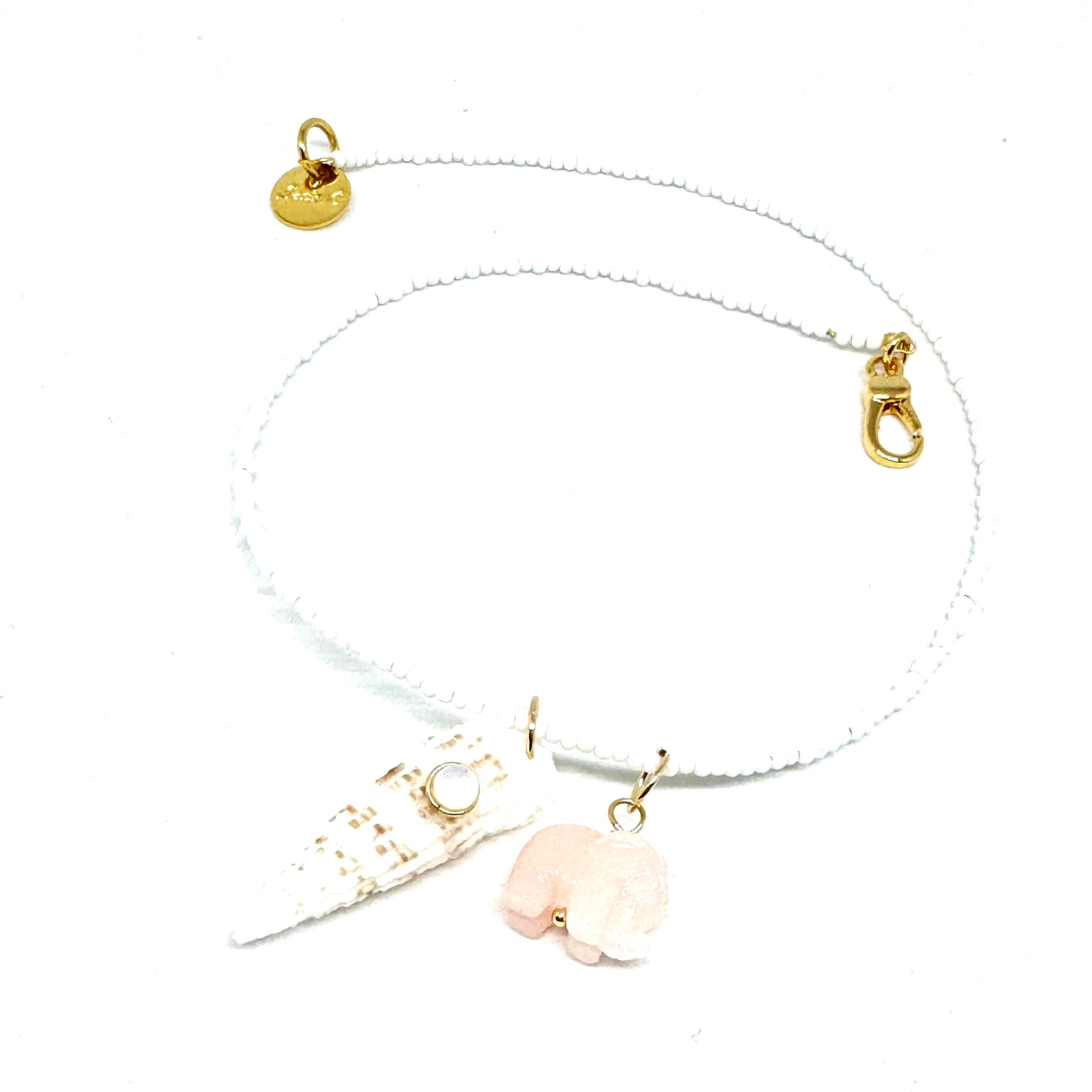 Collana girocollo lunga 35cm infilata a mano con perline bianca, conchiglia e elefantino. Pezzo unico.
