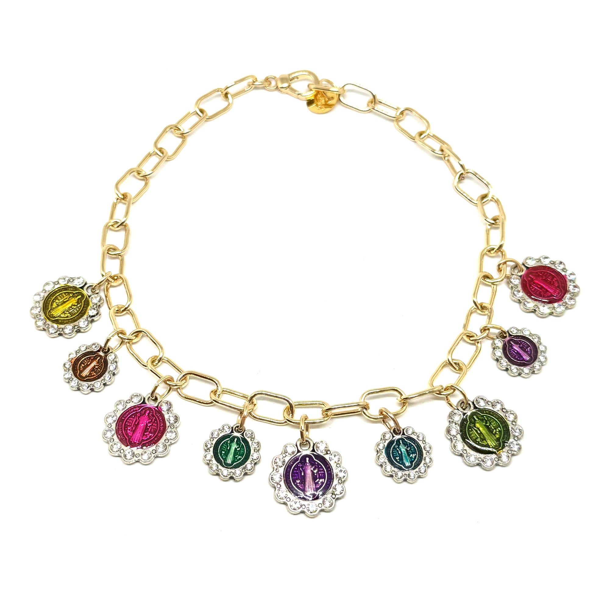 Collana girocollo con catena in ottone placcata oro lunga 35cm, 9 Medagliette San Benedetto colorate e resinate a mano.