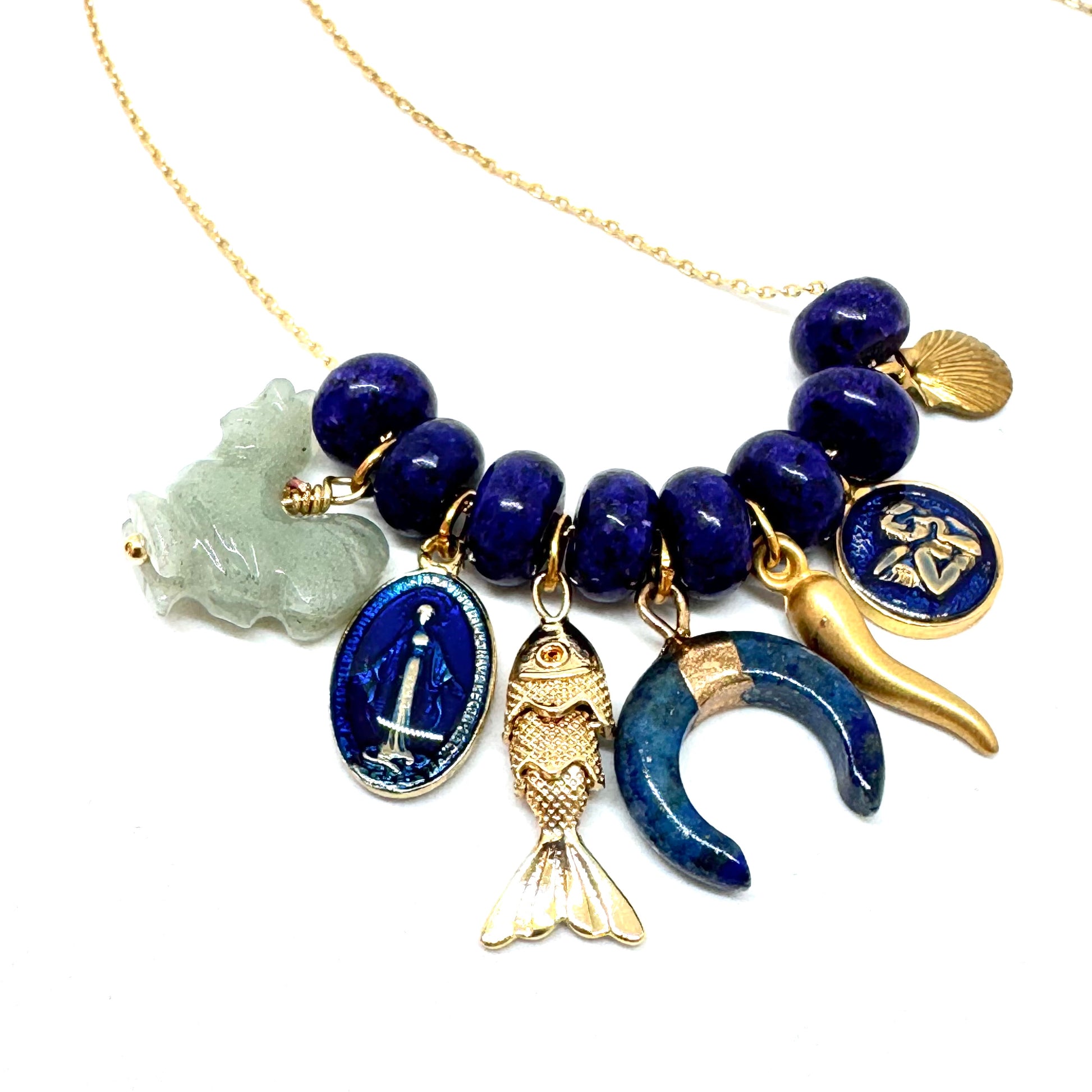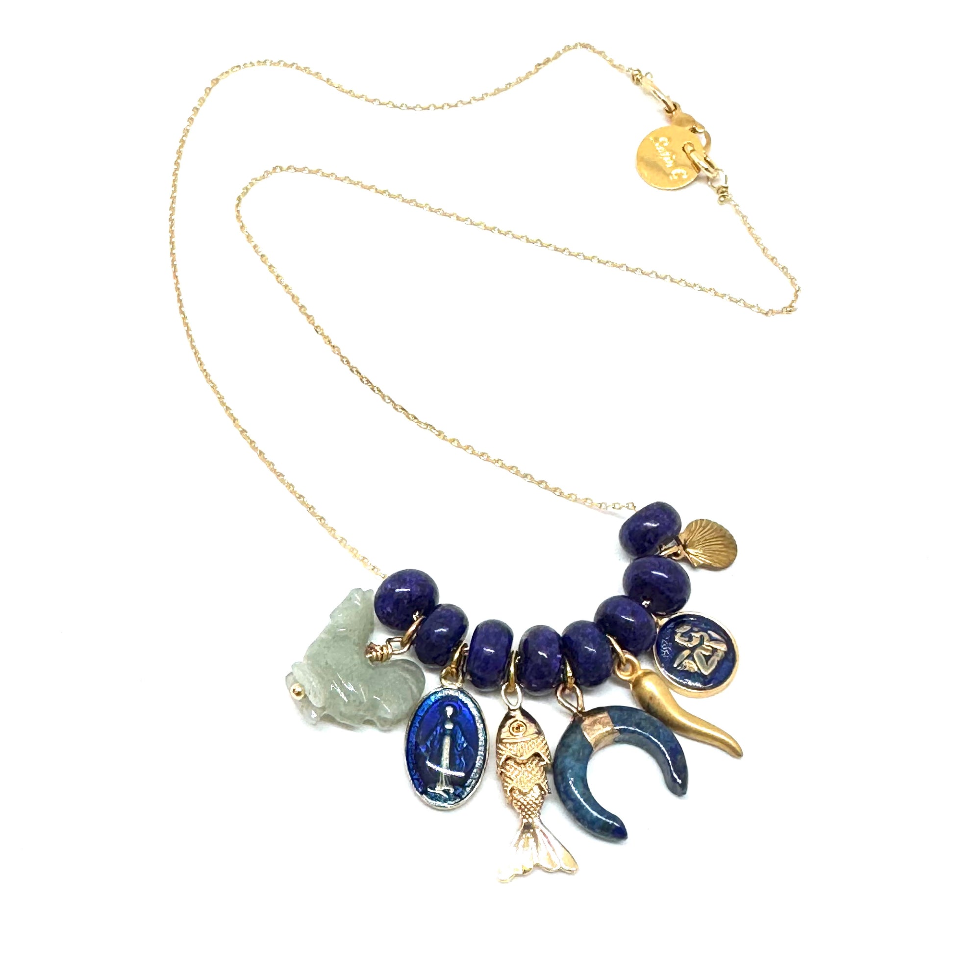 Catenina sottile in ottone placcato oro, lunga 45 cm. Perline in pietra dura e charme vintage porta fortuna.